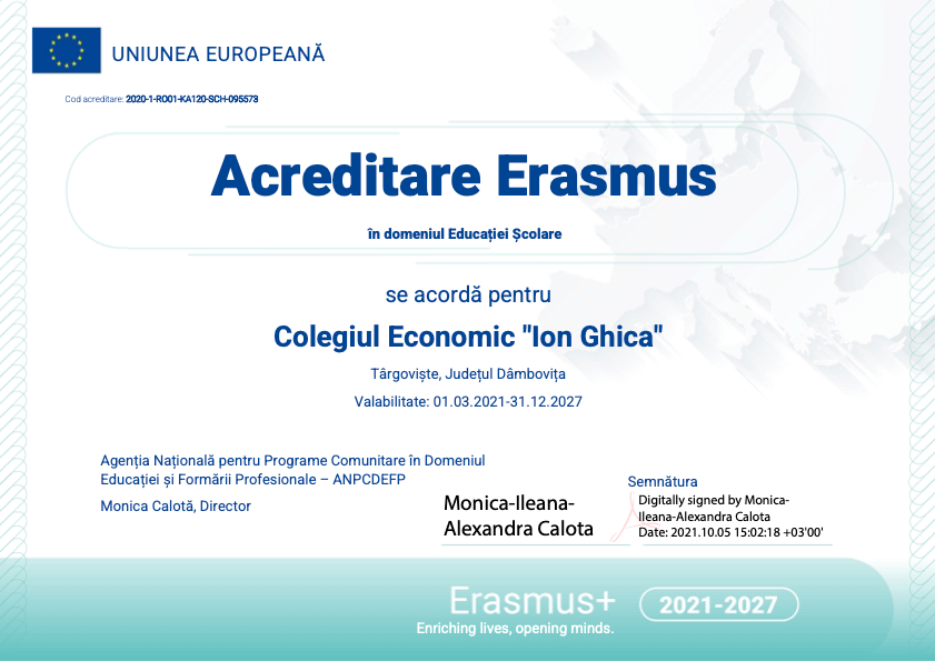 Liceul Tehnologic „Ion Ghica” din Târgoviște este acreditat Erasmus+ în domeniul educației școlare, un statut care reflectă angajamentul nostru constant pentru dezvoltarea profesională, deschiderea internațională și inovația în educație. Această acreditare ne oferă acces la finanțare europeană, care sprijină mobilități educaționale și parteneriate strategice cu școli și instituții din întreaga Europă. Prin Erasmus+, elevii și profesorii noștri au șansa să participe la schimburi de experiență, stagii de formare, vizite de studiu și activități internaționale menite să dezvolte competențele-cheie ale secolului XXI: comunicarea în limbi străine, abilitățile digitale, spiritul civic și antreprenorial.