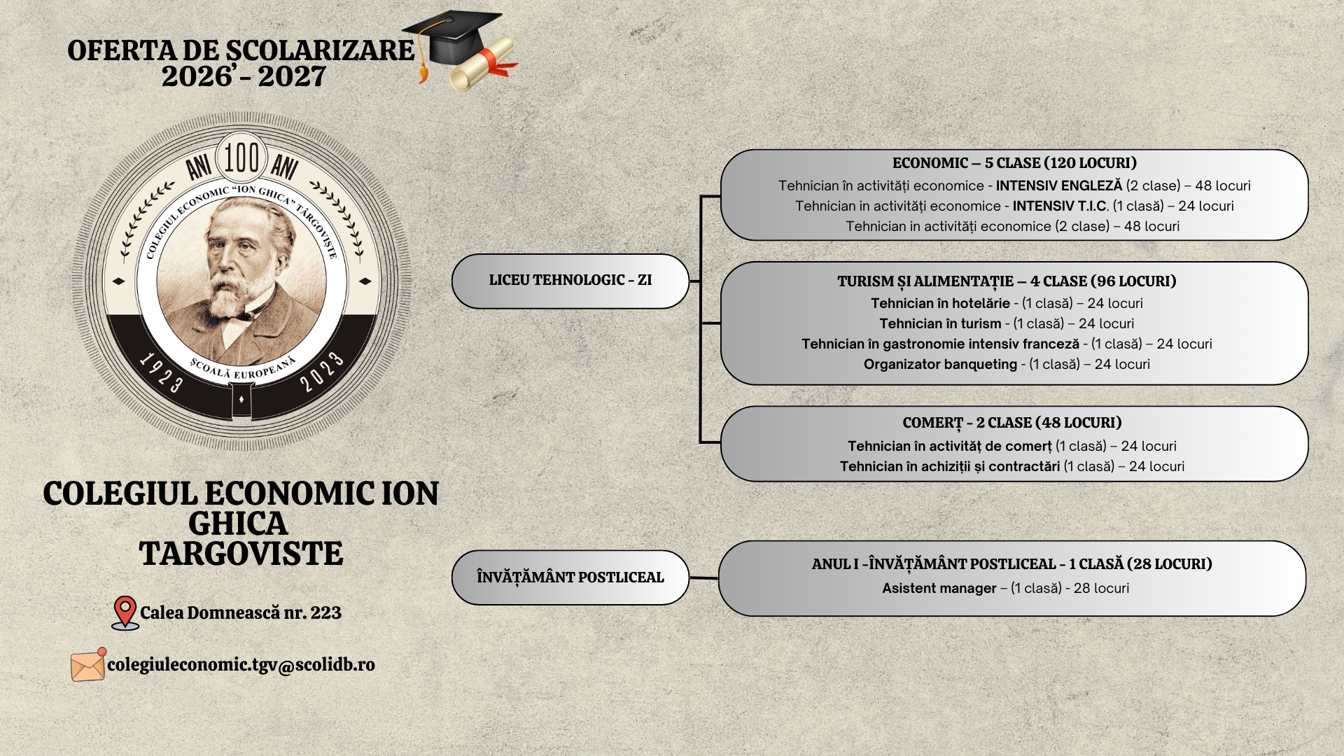 Școală europeană/ 100 de ani de învățământ economicColegiul Economic „Ion Ghica„ Târgoviște OFERTA DE ȘCOLARIZARE
